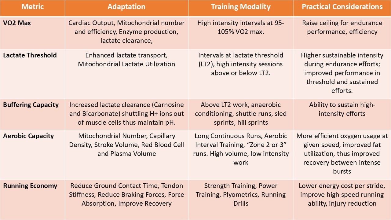 When it comes to aerobic training, many adaptations occur (Table 1) in order to improve performance; therefore, it is important to know which intensities target the desired adaptations. So far we have covered VO2 max and Lactate threshold, which we can target by training at these speeds; however the bulk of a training program would involve training at much lower intensities to target important aerobic system adaptations