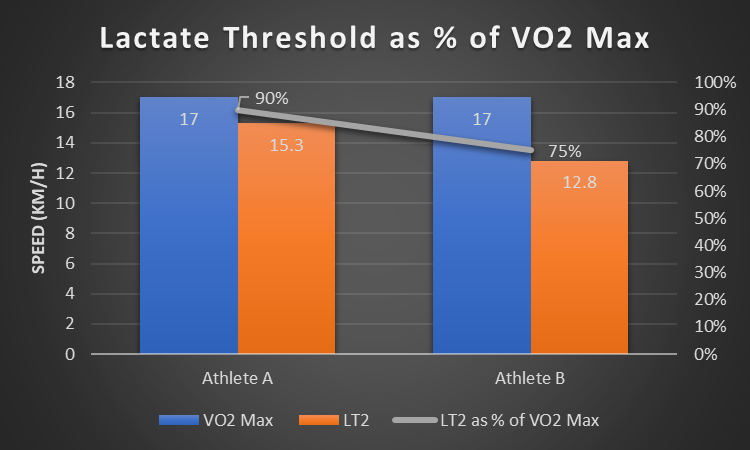 In the chart above, we can see that both Athlete A and Athlete B have the same VO₂ max but different lactate thresholds. Athlete A is well-trained, with a threshold at 90% of their VO₂ max pace. They can sustain a pace of 15.3 km/h (under 4:00/km) for a prolonged period, whereas Athlete B can only sustain 12.8 km/h (4:41/km). Athlete B is less trained, with a threshold pace at 75% of their VO₂ max. Therefore, we can infer that Athlete B has significant room for improvement and should focus on raising their lactate threshold. Based on these metrics, we can strongly predict who would achieve a better result in a race.